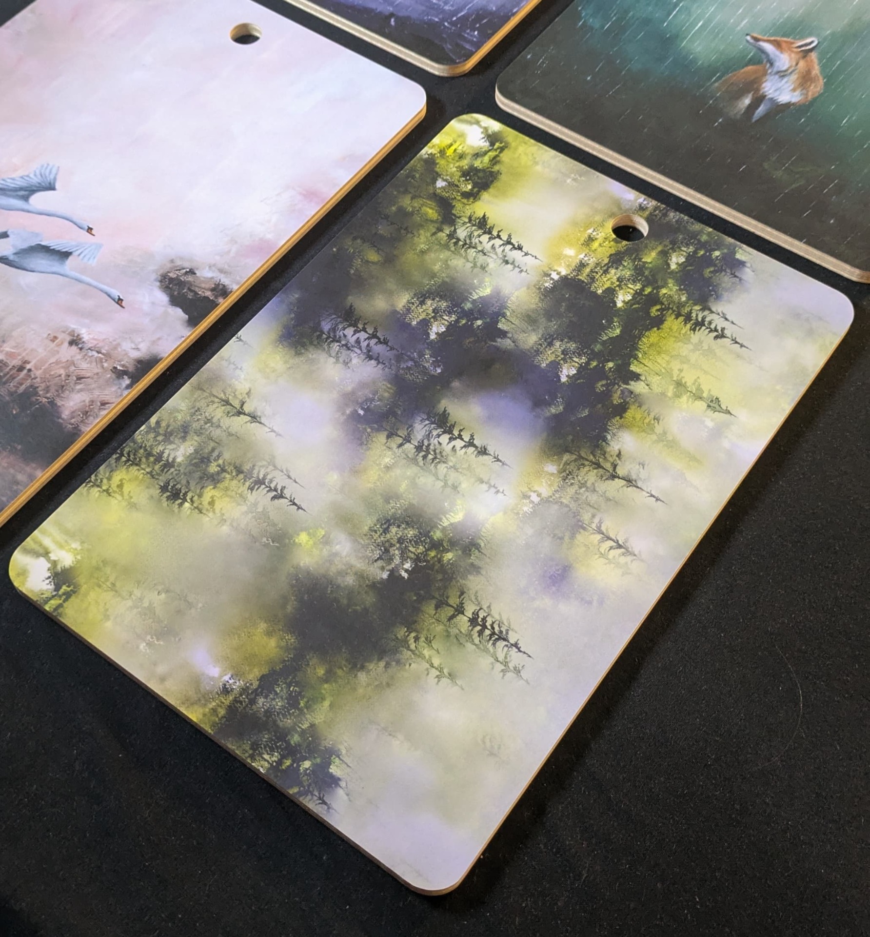 Kaunis ja kestävä leikkuulauta metsä kuosin kuvalla. Kuosi on maalattu alunperin vesiväreillä. Lauta on valmistettu Suomessa kestävästä koivuviilusta ja pinnoitettu melamiinipäällysteellä. Pinta kestää kuumuutta, joten sitä voi käyttää myös
