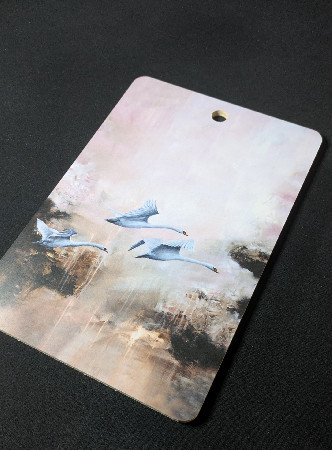 Kaunis ja kestävä leikkuulauta "Aika lähteä" joutsen maalauksen kuvalla. Lauta on valmistettu Suomessa kestävästä koivuviilusta ja pinnoitettu melamiinipäällysteellä. Pinta kestää kuumuutta, joten sitä voi käyttää myös pannunalusena. Valmistusmateriaalit ovat elintarviketestattuja ja sertifioituja. Koko: 20 x 30cm.