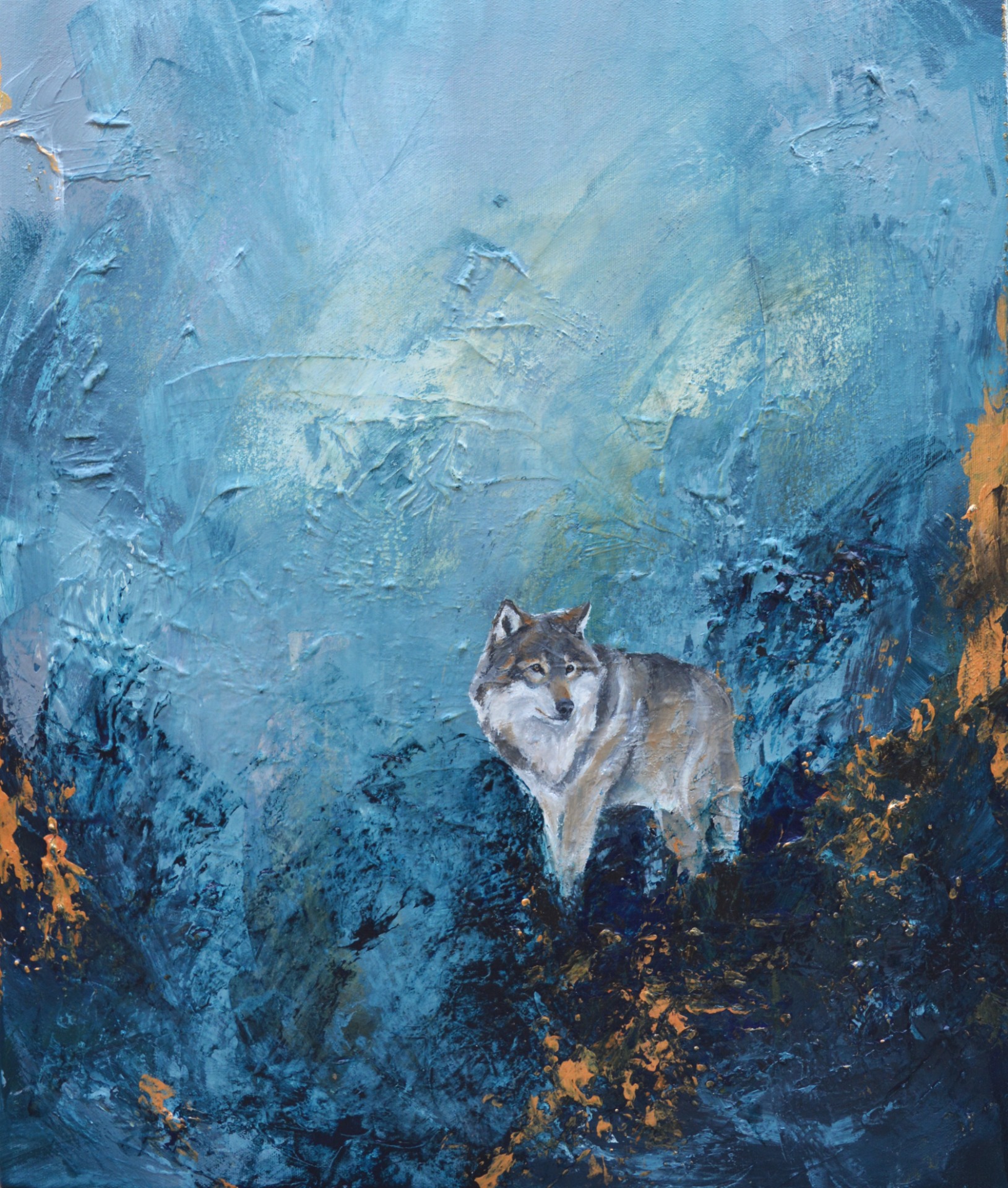 Akryylimaaleilla maalattu teos sudesta abstraktilla taustalla. Maalauksen koko on 55x46cm. Ripustusvalmis. Lisäkuvia mahdollista saada sähköpostilla. Postikulut tai nouto sovitaan erikseen. Esillä Tampereella kahvila Runossa maaliskuun loppuun saakka